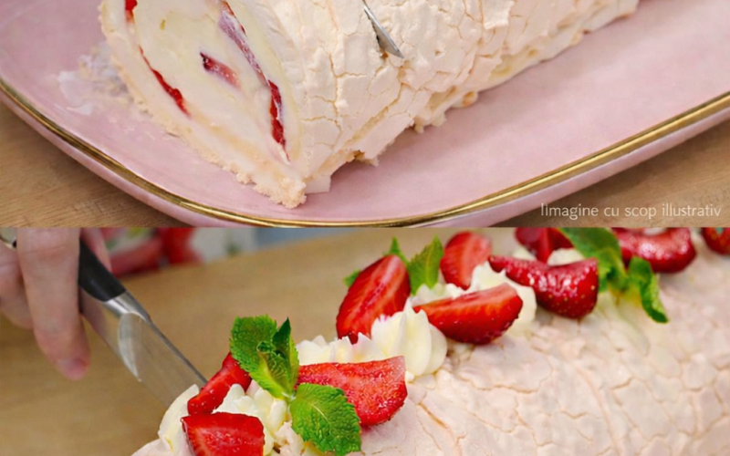 Dacă îți dorești un desert aerat, delicat și spectaculos, această ruladă Pavlova cu căpșuni este o alegere excelentă. Textura ușoară a bezelei, combinată cu o