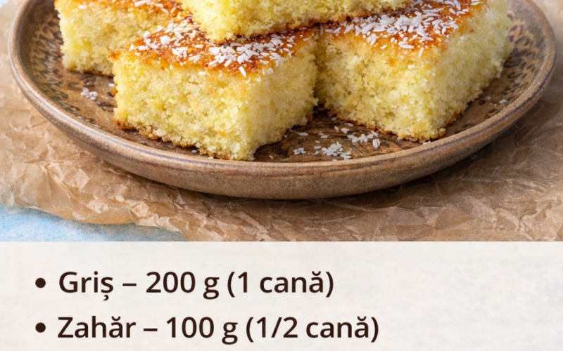 Această prăjitură tradițională cu griș este extrem de ușor de făcut, pufoasă și ușor umedă, perfectă lângă o cafea sau un ceai. Are ingrediente simple,